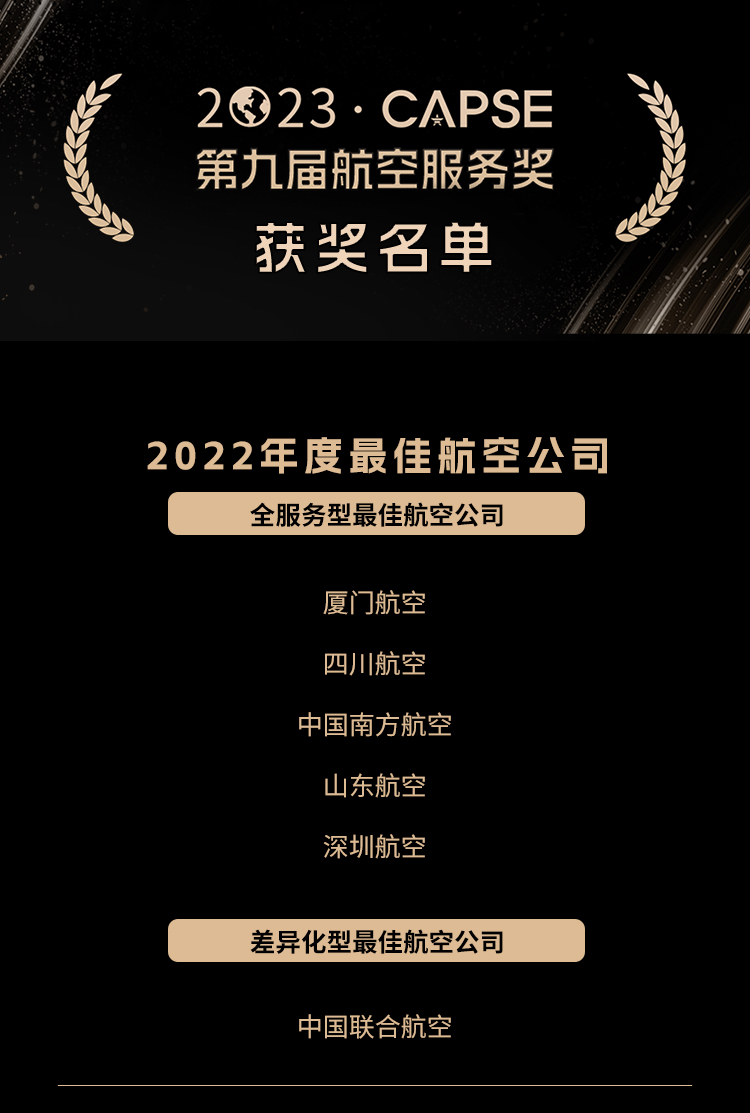 6月20日,由CAPSE主办、深圳机场协办、深圳航空特别支持的2023CAPSE年度峰会在深圳隆重举办、成功闭幕,会上公布了第九届CAPSE航空服务奖榜单!