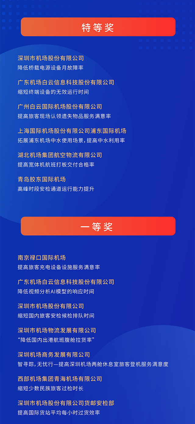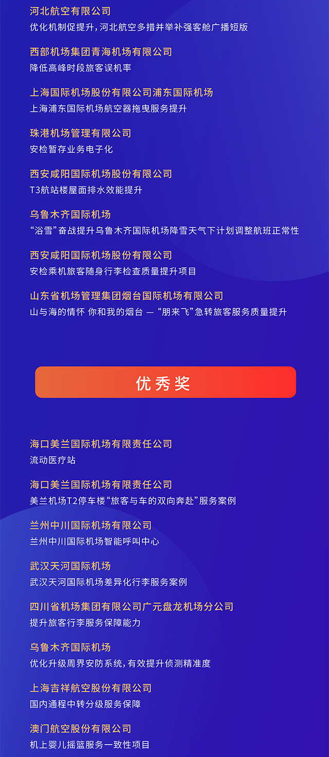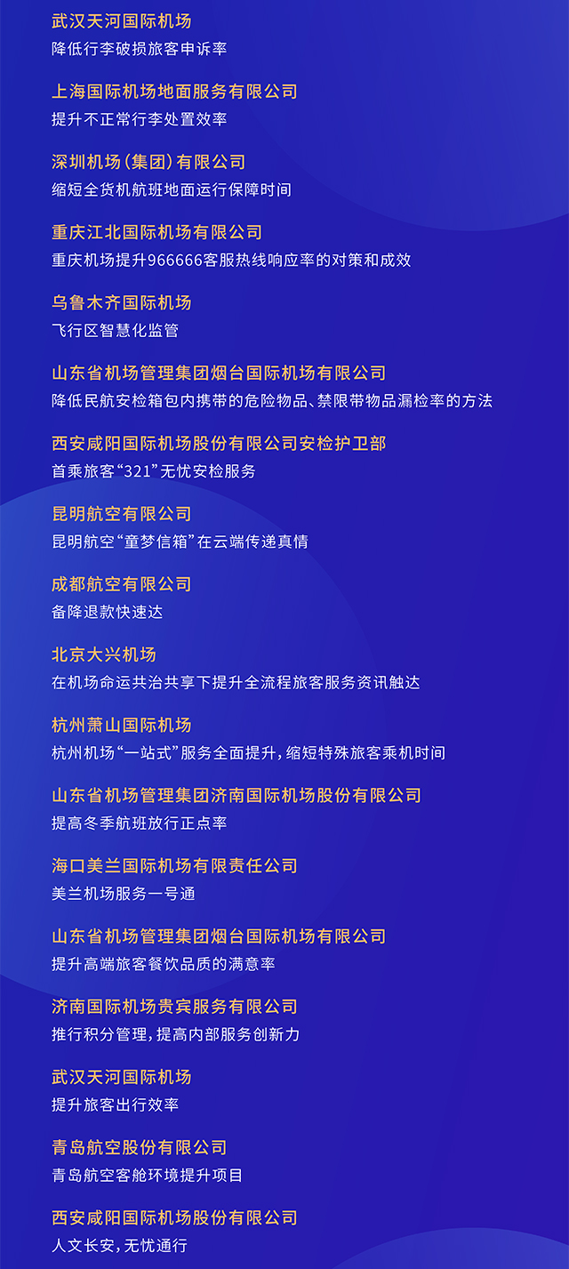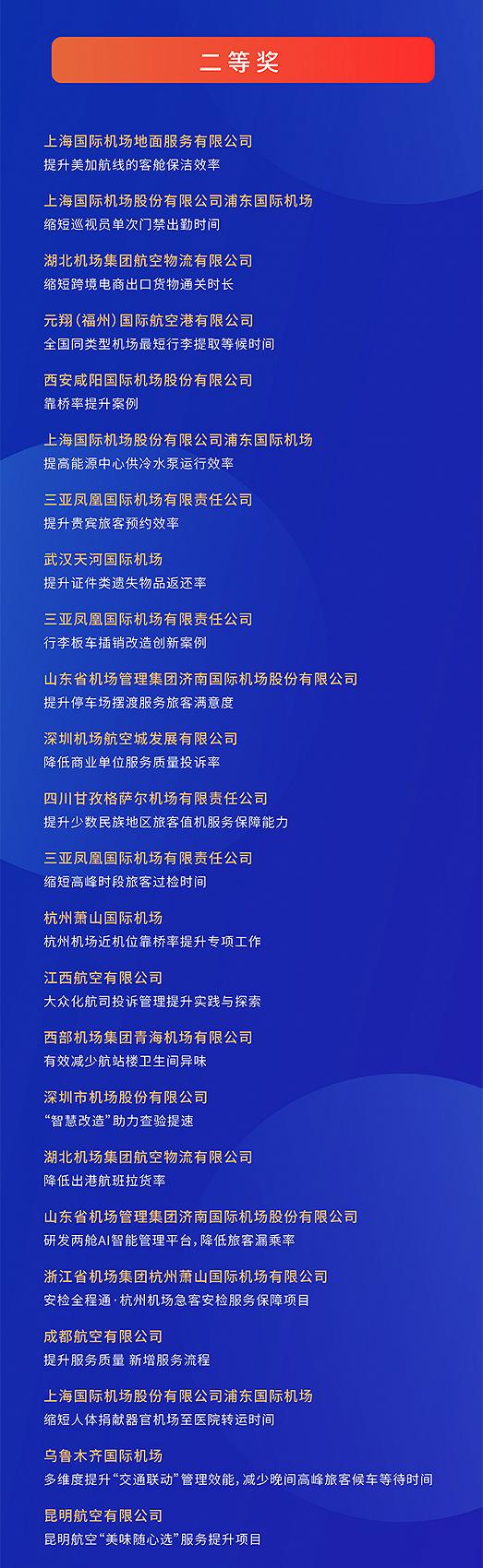 经过层层选拔,最终共计127个案例顺利参与到线下评审的环节,在以上案例中,共计有11家航司,42家机场,现场参赛人数达270余人,其中特等奖6名,一等奖7名,二等奖25名,三等奖43名,优秀奖46名。